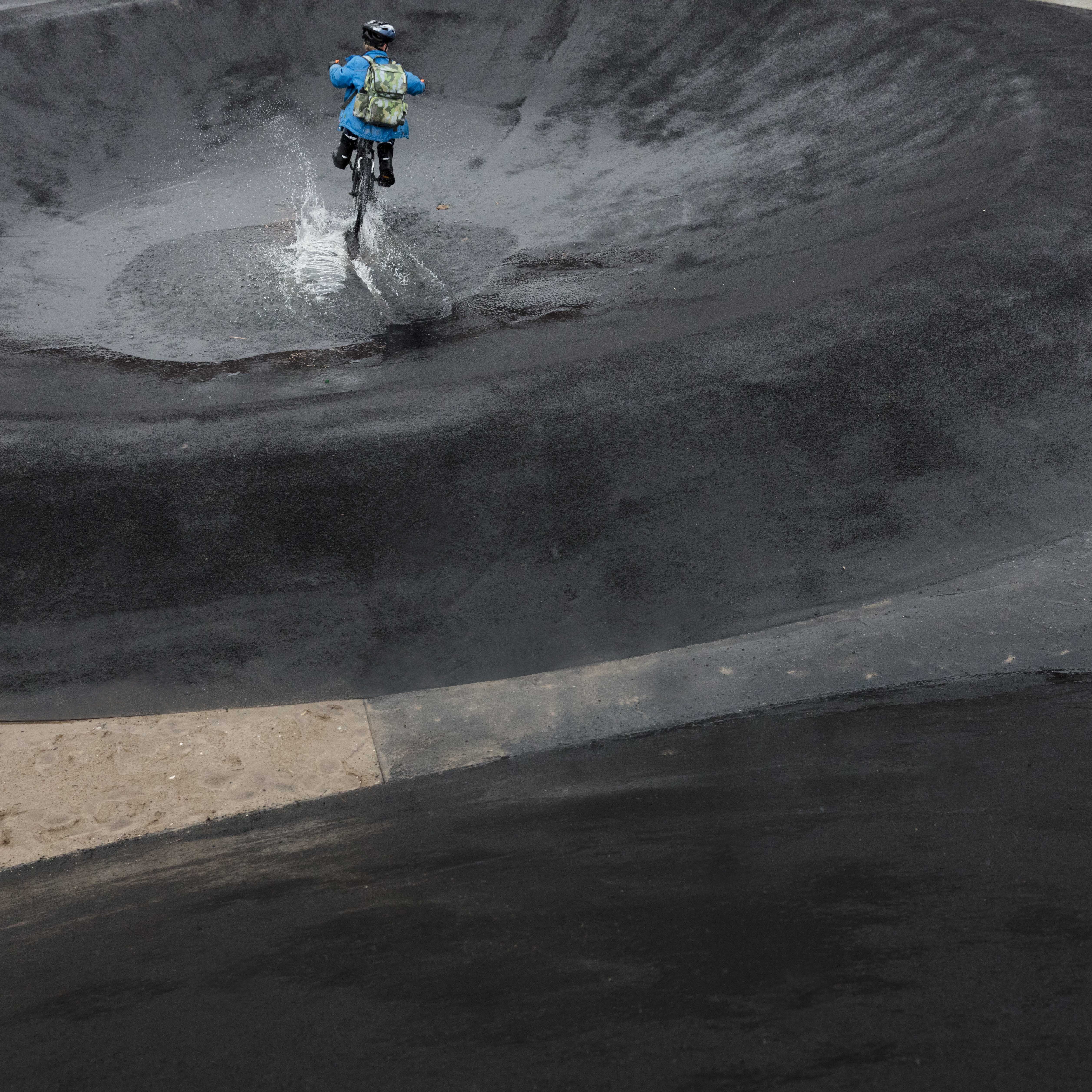 I stedet for at skjule regnvandet i rør under jorden er det nu synligt som en smuk, aktiv del af byens rum, og åen, som tidligere var byens bagside, er nu blevet dens samlende forhave. Dobbeltprogrammerede løsninger er et centralt greb: haver fungerer som grønne forsinkelsesbassiner, og den lokale boldbane er omkranset af en græsbevokset jordvold, så den ved skybrud kan opsamle vand.