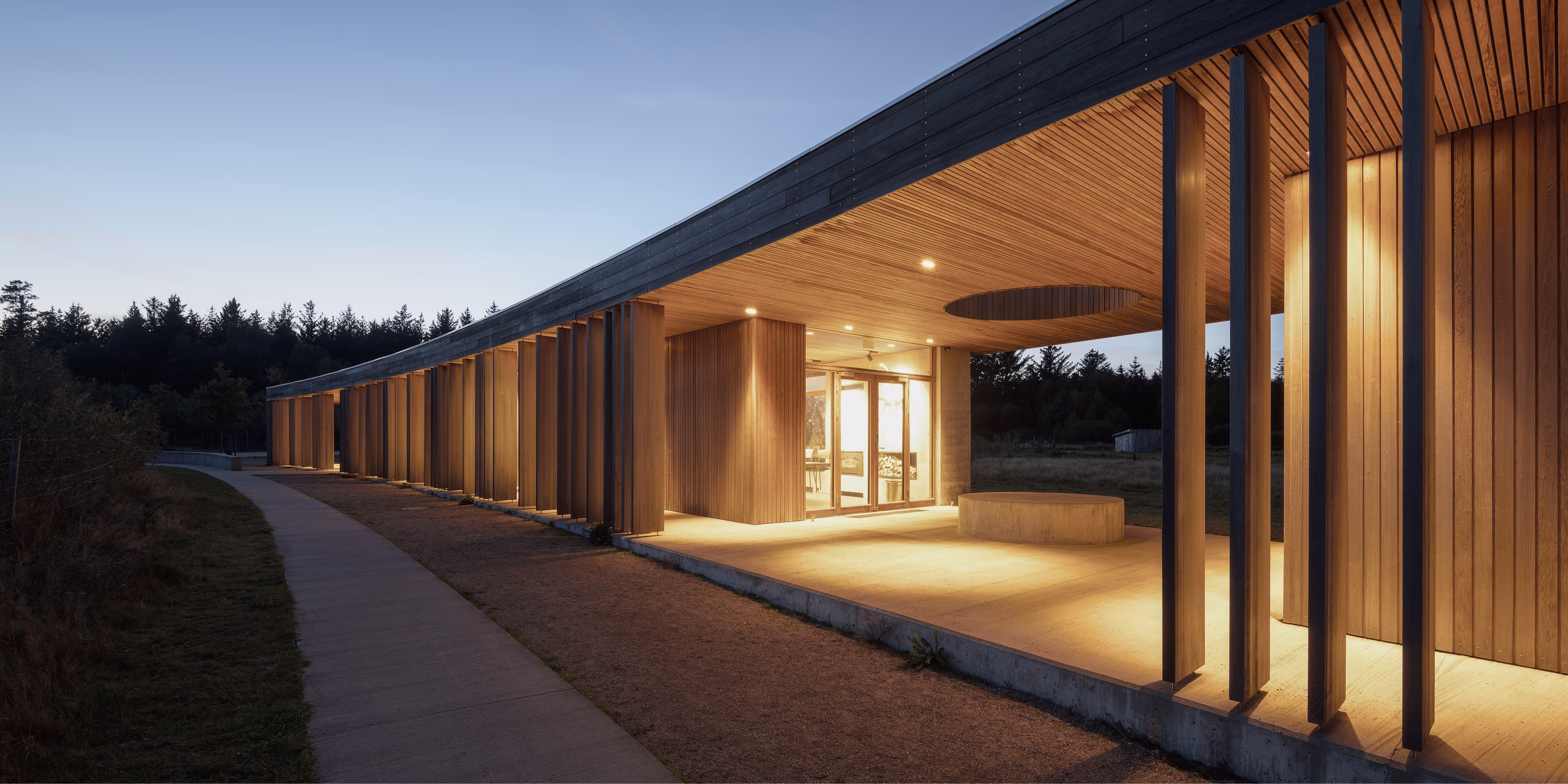 The educational building is the architectural focal point, located in the transition zone between forest and wetland. It follows the overarching elliptical landscape design and integrates naturally into the sequence from arrival to view point. The building’s exterior colonnade mirrors the forest edge and creates arhythmic transition between inside and outside. Large window sections with louvered walls provide flexible light control and visual connection to the landscape, while a fireplace and integrated niches create warmth and places for gathering.