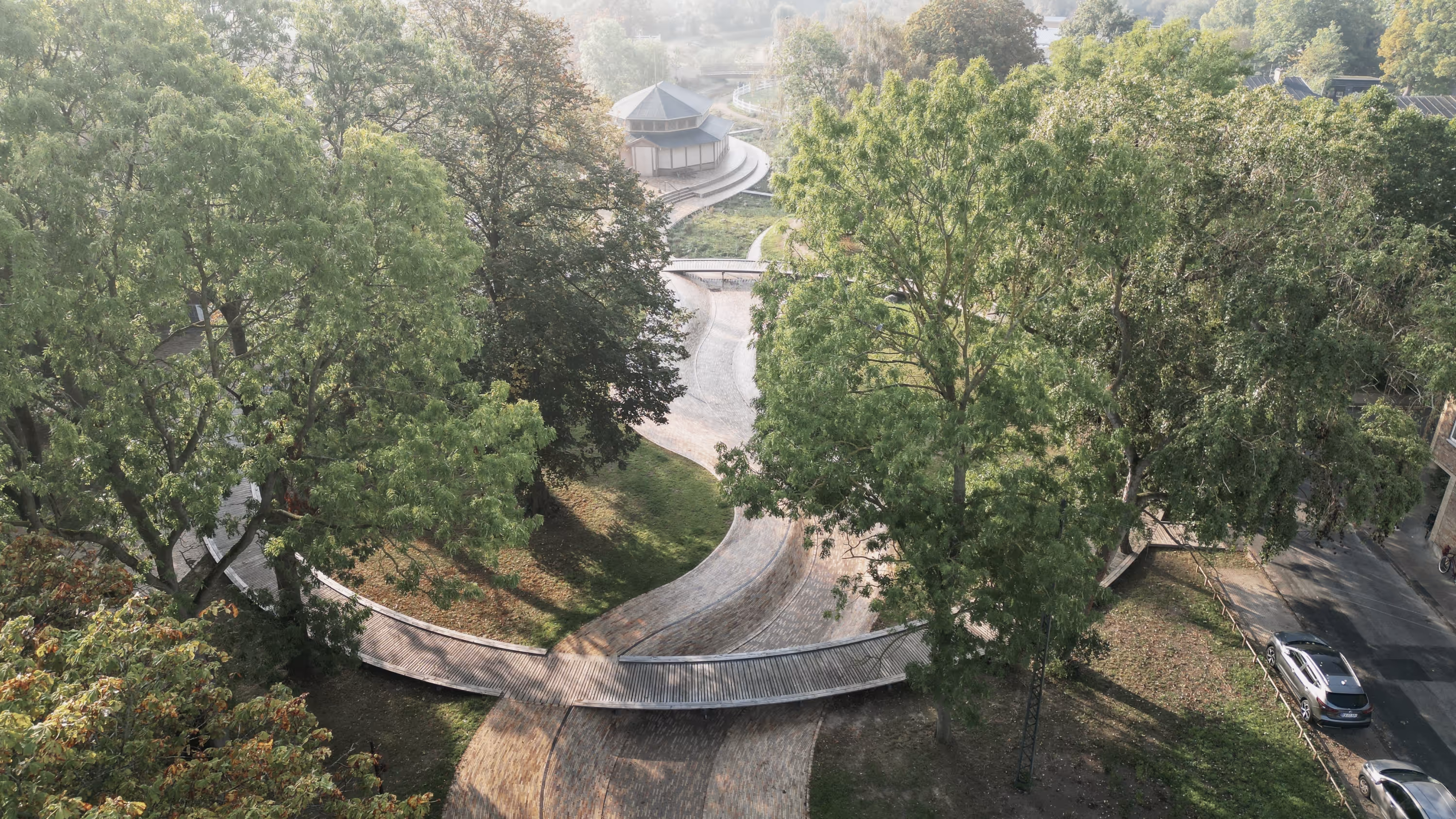 En samlende cirkelbro af træ ved kulturhuset Karens Minde, erstatter de mange stier på kryds og tværs, der tidligere prægede området i den noget nedslidte park.